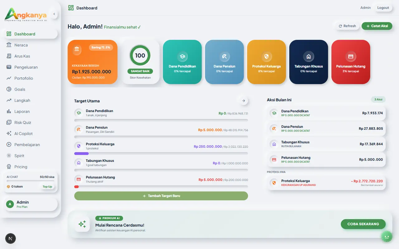 AI Copilot memberikan rekomendasi alokasi investasi sesuai profil risiko. Pantau progress goals setiap bulan dan catat setiap langkah keuangan yang diambil.